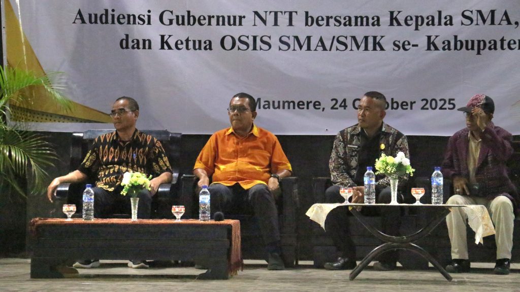 NTTBersuara.id, MAUMERE,– Gubernur Nusa Tenggara Timur, Emanuel Melkiades Laka Lena, menekankan pentingnya sinergi antara keluarga, sekolah, dan masyarakat sebagai kunci utama dalam membangun kualitas pendidikan di NTT. Hal ini disampaikan saat audiensi bersama 51 Kepala SMA, SMK, dan SLB, serta para Ketua OSIS SMA/SMK se-Kabupaten Sikka di Aula SMA Negeri 1 Maumere, Jumat 24 Oktober 2025