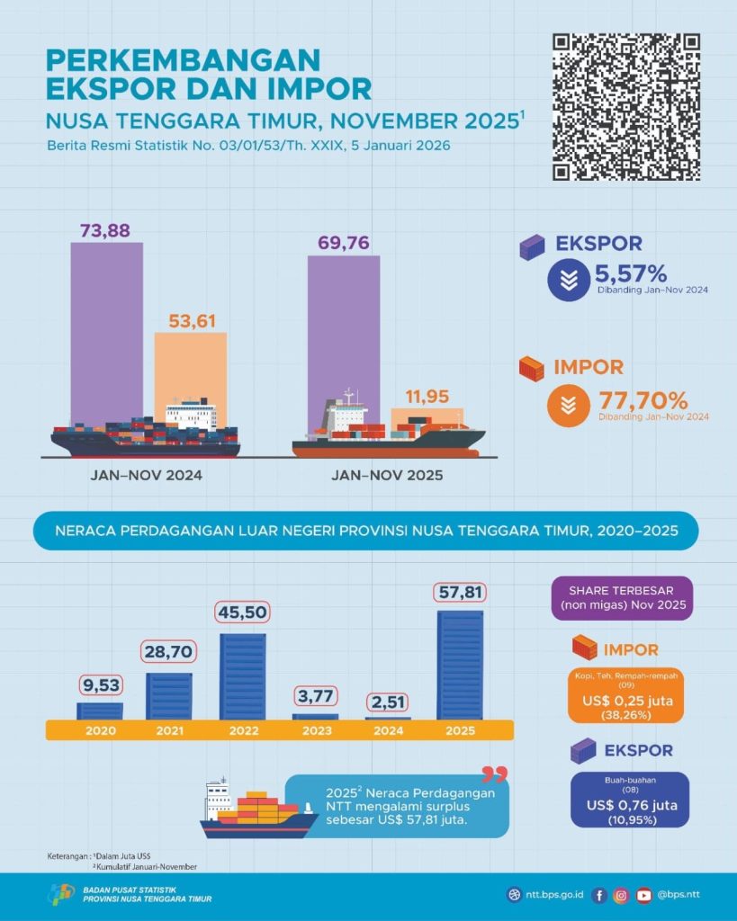Nilai ekspor Nusa Tenggara Timur bulan November 2025 mencapai 6,95 juta Dolar AS atau turun 24,94 persen dibanding November 2024. Ekspor non migas November 2025 mencapai 6,8 juta Dolar AS, turun 23,72 persen dibandingkan November 2024.
