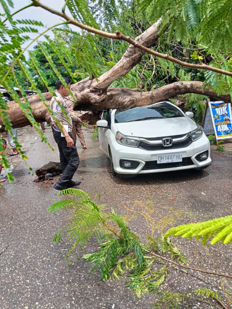 Peristiwa terjadi ketika mobil melintas di ruas jalan tersebut. Tiba-tiba pohon besar di pinggir jalan roboh dan langsung menimpa kendaraan.